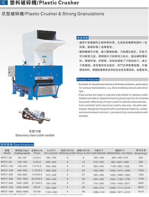 適用于各種逆料之粉碎再利用,尤其對(duì)各類硬性塑料(如料頭,鞋楦料等)效果更佳。NPCY系列破碎機(jī)操作方便,換刀簡便快捷;刀架優(yōu)化設(shè)計(jì),爪型刀可分散受力度,便得每片刀和剪切力加大,適合破碎厚材料,硬質(zhì)料塊,料頭等,有效的提高了刀具切削力,減少刀具磨損;設(shè)有電控按全設(shè)計(jì),料頭采用雙層結(jié)構(gòu),內(nèi)填隔音材料,使得設(shè)備具有良好的安全性及環(huán)保性,省電耐用。
